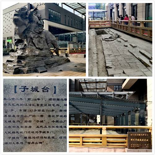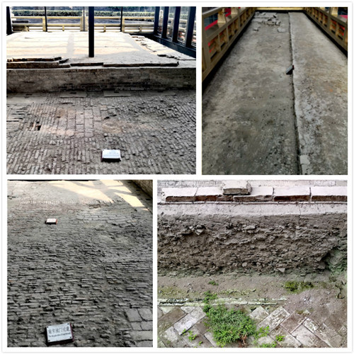 走着走着,我们来到了现在的爱山广场步行街区东面、人民路西侧,前些年这里发掘出了晚唐、五代吴越国、南宋的仅存城墙遗址。从保护着的原始实物和文字介绍中我们得知,2007年11月,在城中步行街建设过程中,上泰和坊,就是现在的人民路发现了子城东城墙墙基。从城墙墙基剖面来看,中间是夯土墙,可以印证秦末项羽所筑城墙和春秋时金盖山下的下菰城一样,都是泥质的。夯土墙内外有纪年砖块,铭文是汉“永初二年(108)作”字样,说明汉代乌程县治设于项王城时,在夯土墙内外砌砖墙加以保护。2008年,博物馆组织专业人员在上泰和坊地段进行发掘,发掘面积达1500平方米,终于发现子城东门遗址,遗址有甬道、城门墙基等,甬道宽4.6米,城门墙基厚9.8米。