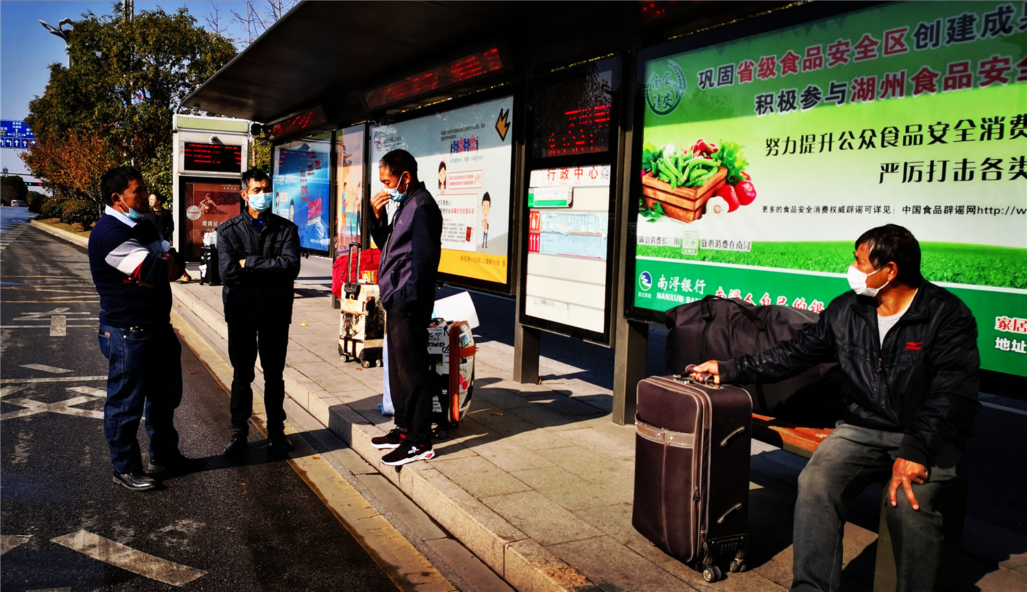 这天上午走过南浔区行政中心公交车站,看见四名提着拉杆箱和行李包、蛇皮袋的男人急匆匆、气喘吁吁地走来,头上还冒着汗。甫一停下,便向独自徘徊站台的我打招呼并问道:“去高铁站的101公交是不是在这里乘的?”我答:“对的,是这里。”